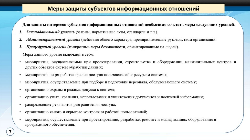 Меры защиты субъектов информационных отношенийДля защиты интересов субъектов информационных отношений необходимо сочетать меры следующих уровней: