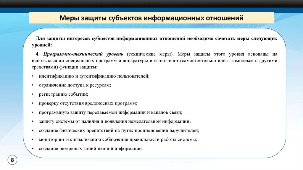4. Программно-технический уровень (технические меры). Меры защиты этого уровня основаны на
