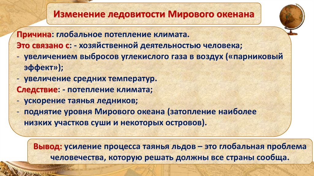 Изменение ледовитости Мирового окенанаПричина: глобальное потепление климата.
