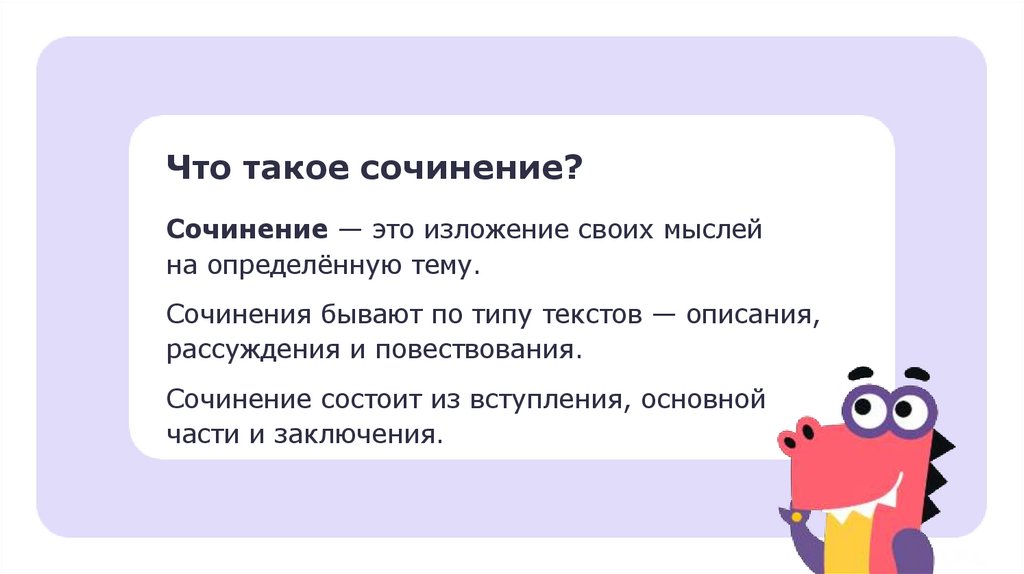 Что такое сочинение?Сочинение — это изложение своих мыслей