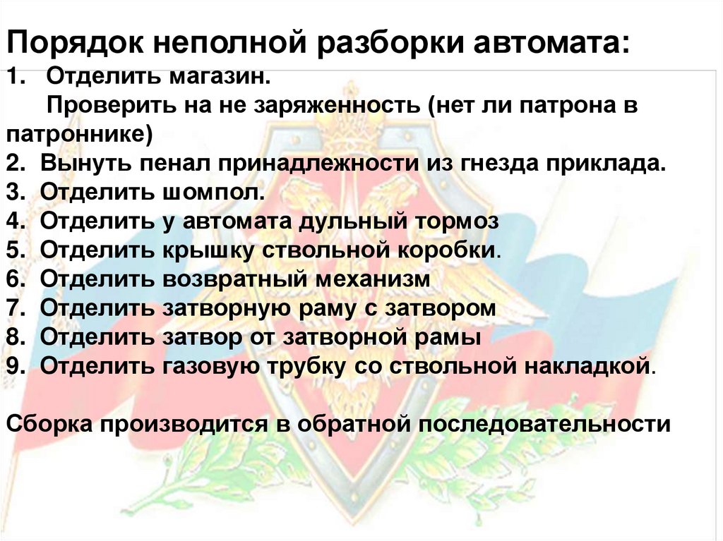 Порядок неполной разборки и сборки посленеполной разборки АК-74