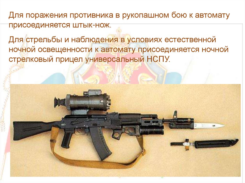 Для поражения противника в рукопашном бою к автоматуприсоединяется штык-нож.