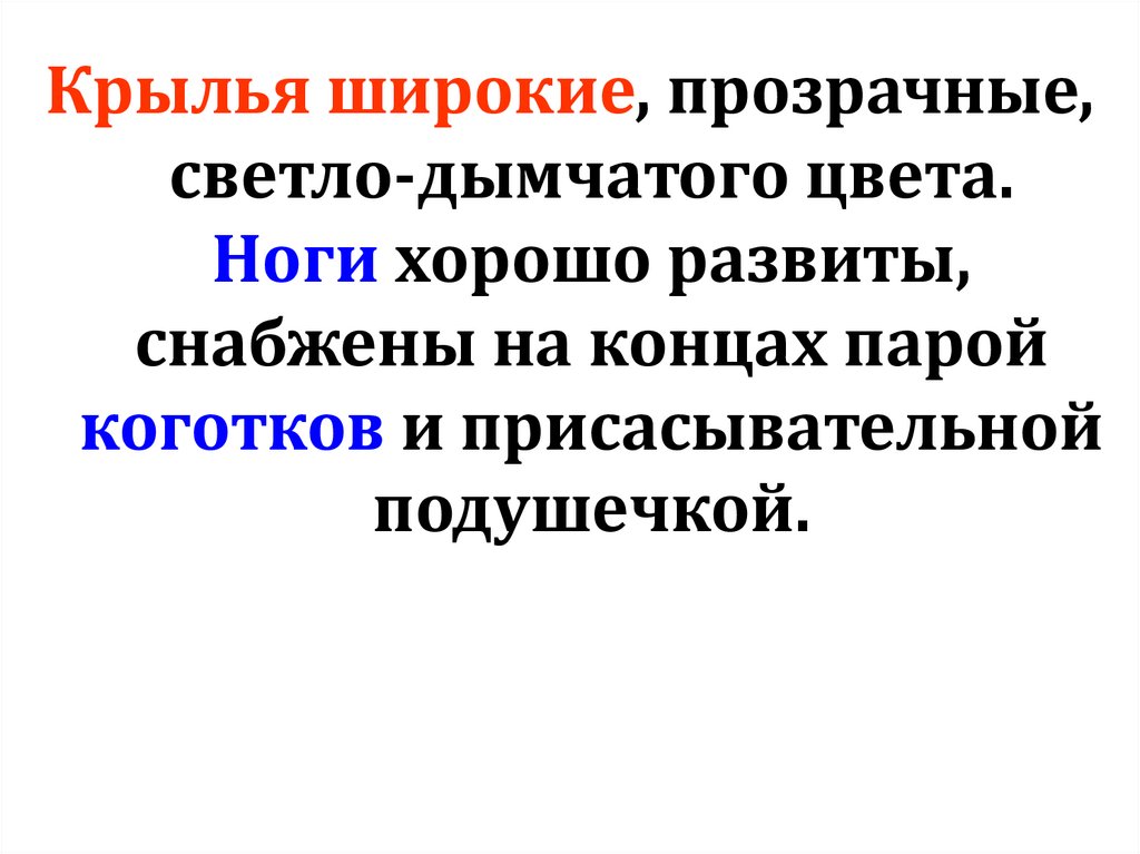Крылья широкие, прозрачные,светло-дымчатого цвета.