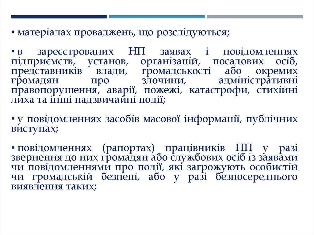 • матеріалах проваджень, що розслідуються;• в зареєстрованих НП заявах і повідомленнях