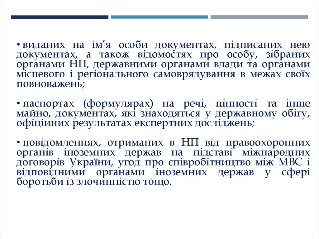 • виданих на ім’я особи документах, підписаних неюдокументах, а також відомостях про особу, зібраних