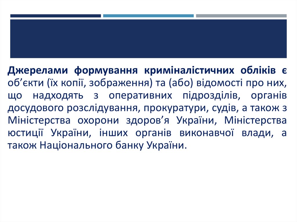 Джерелами формування криміналістичних обліків єоб’єкти (їх копії, зображення) та (або) відомості про них,