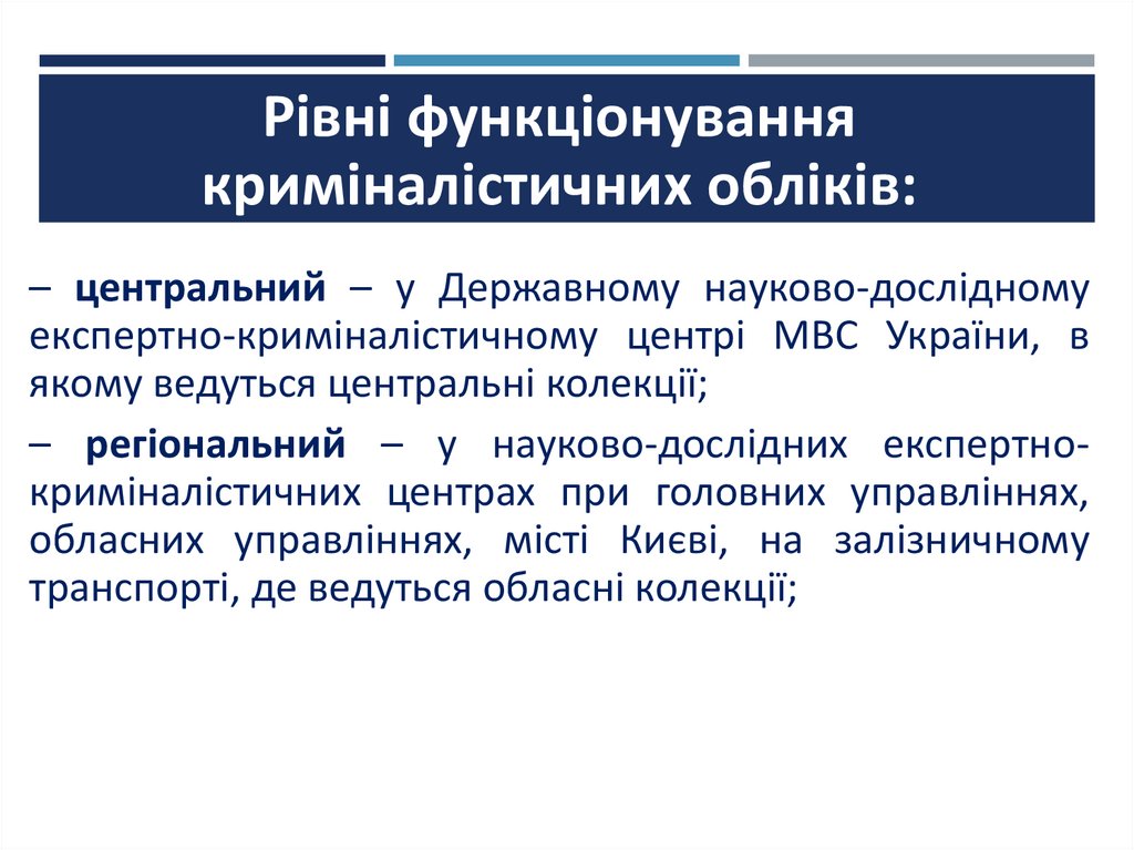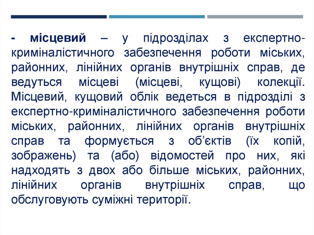 - місцевий – у підрозділах з експертнокриміналістичного забезпечення роботи міських,районних, лінійних органів внутрішніх справ, де