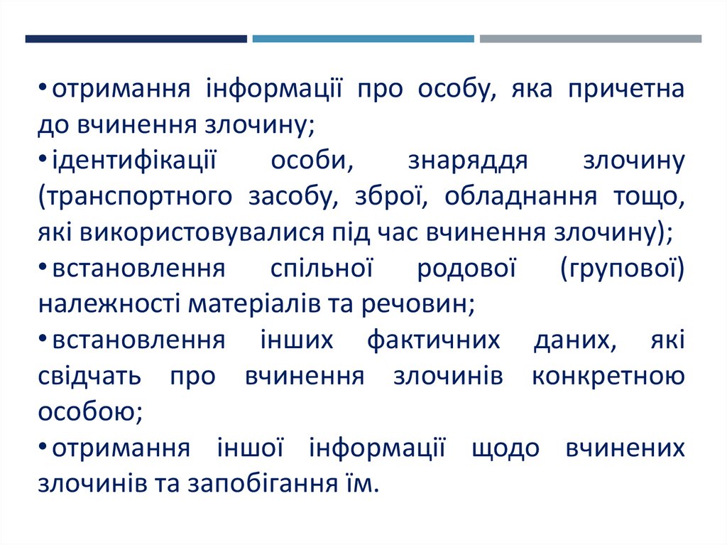 • отримання інформації про особу, яка причетнадо вчинення злочину;