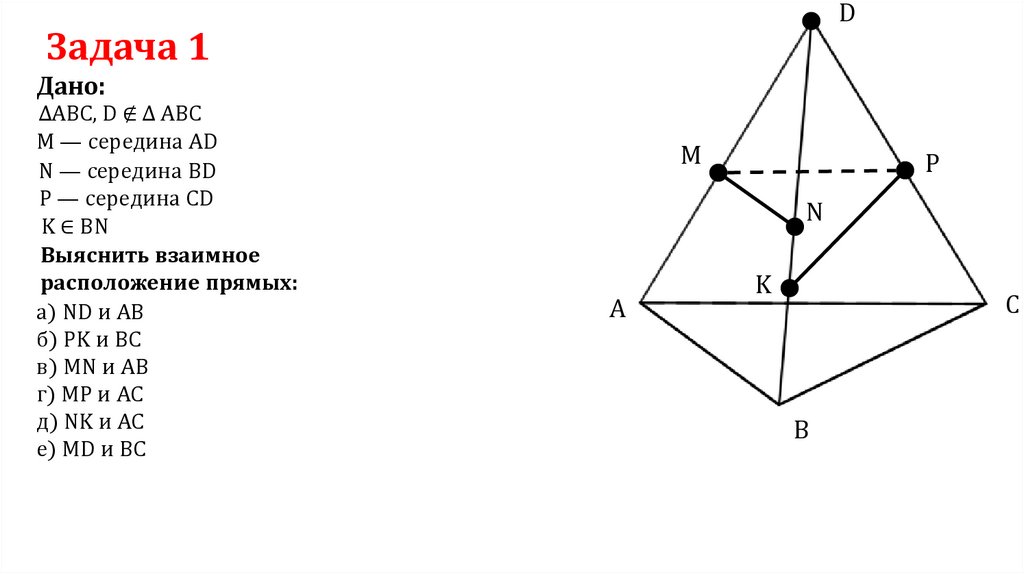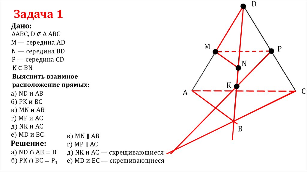 б) PK ∩ BC = P1 е) MD и BC — скрещивающиеся