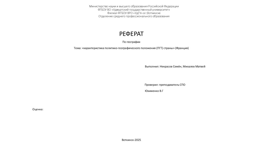 1. Министерство науки и высшего образования Российской Федерации ФГБОУ ВО «Удмуртский государственный университет» Филиал ФГБОУ