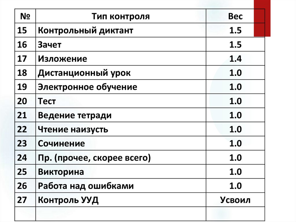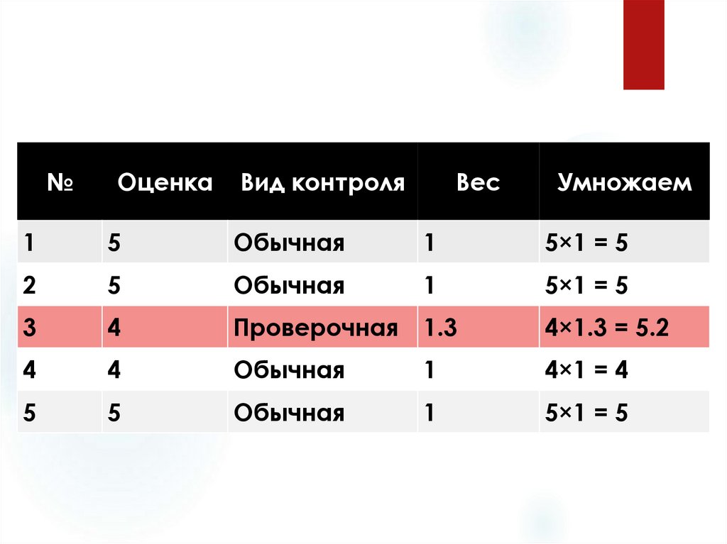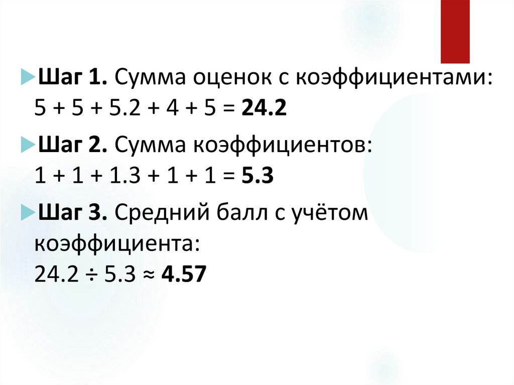 Шаг 1. Сумма оценок с коэффициентами:5 + 5 + 5.2 + 4 + 5 = 24.2