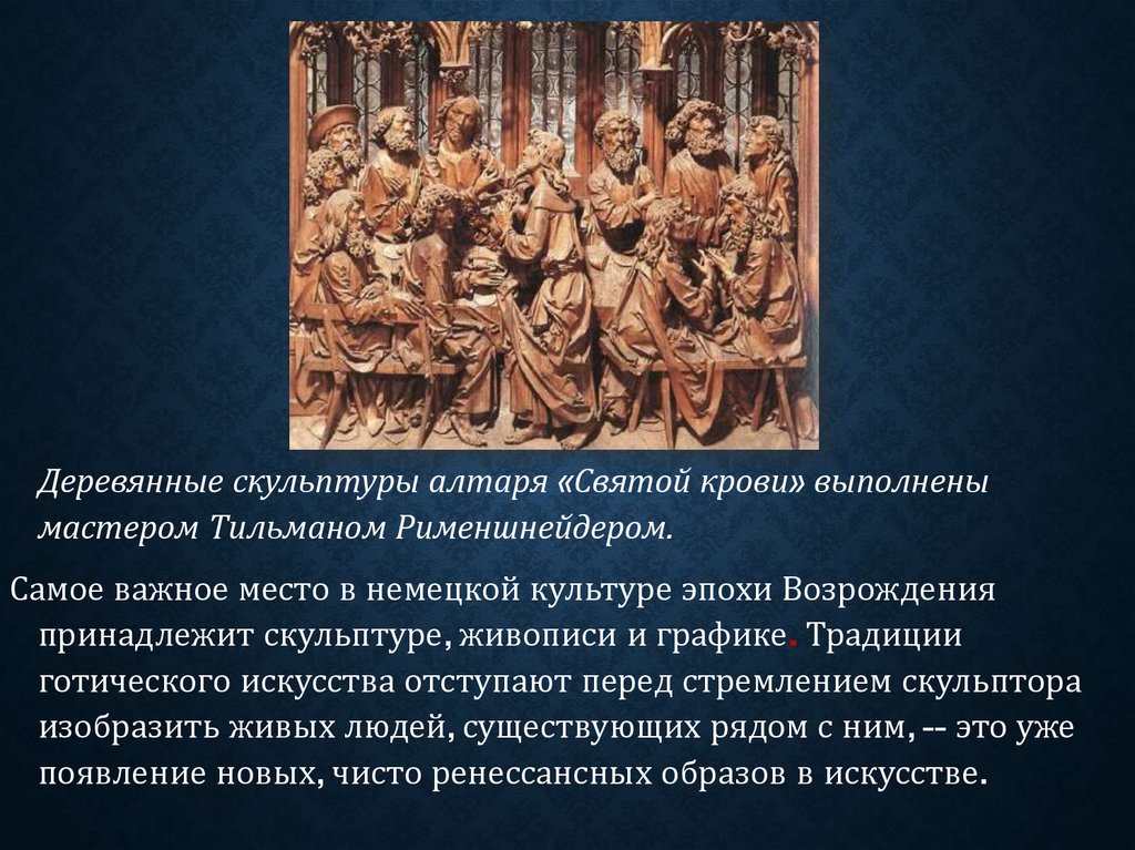 Деревянные скульптуры алтаря «Святой крови» выполненымастером Тильманом Рименшнейдером.