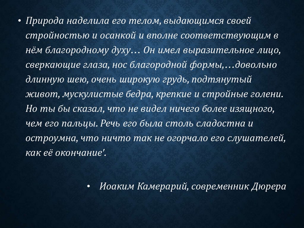ХАРАКТЕРНАЯ ОСОБЕННОСТЬ ИСКУССТВА ДЮРЕРА –ПОИСКИ ЭТИЧЕСКОГО ИДЕАЛА.