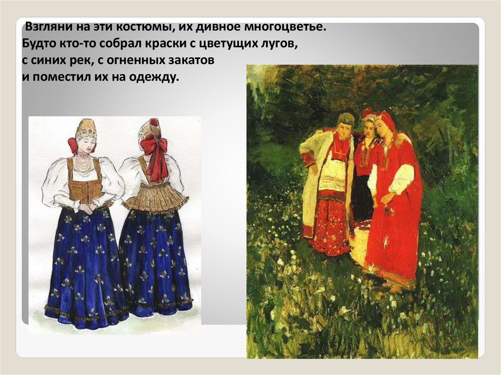 Взгляни на эти костюмы, их дивное многоцветье.Будто кто-то собрал краски с цветущих лугов,