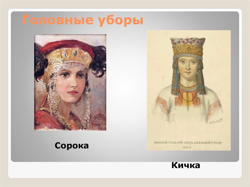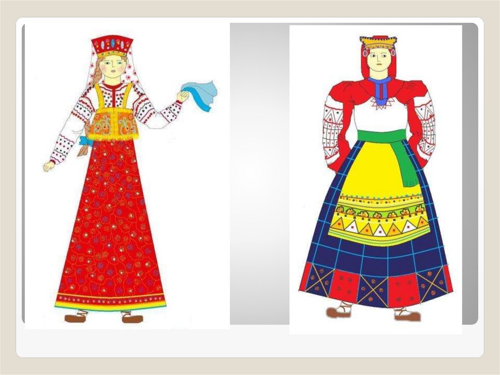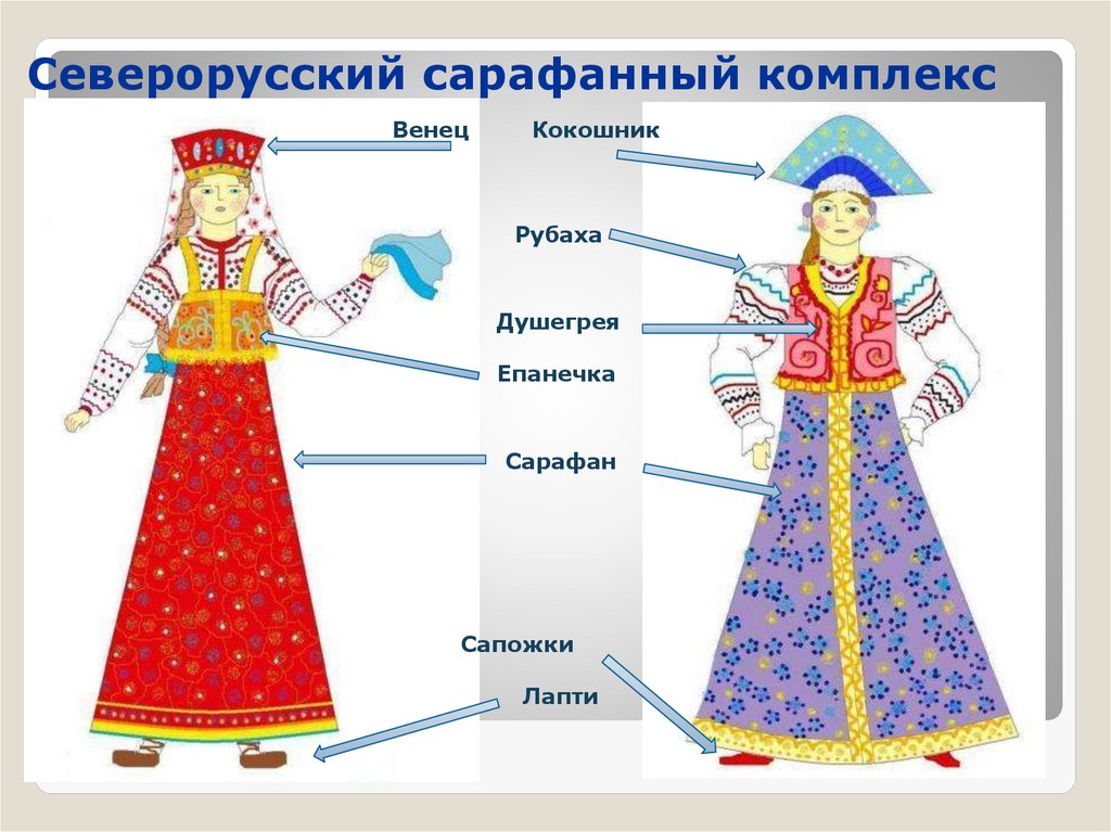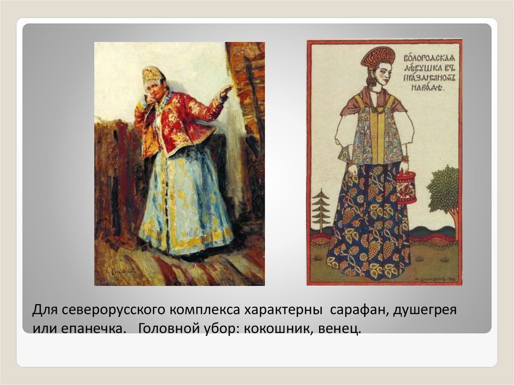 Для северорусского комплекса характерны сарафан, душегреяили епанечка. Головной убор: кокошник, венец.
