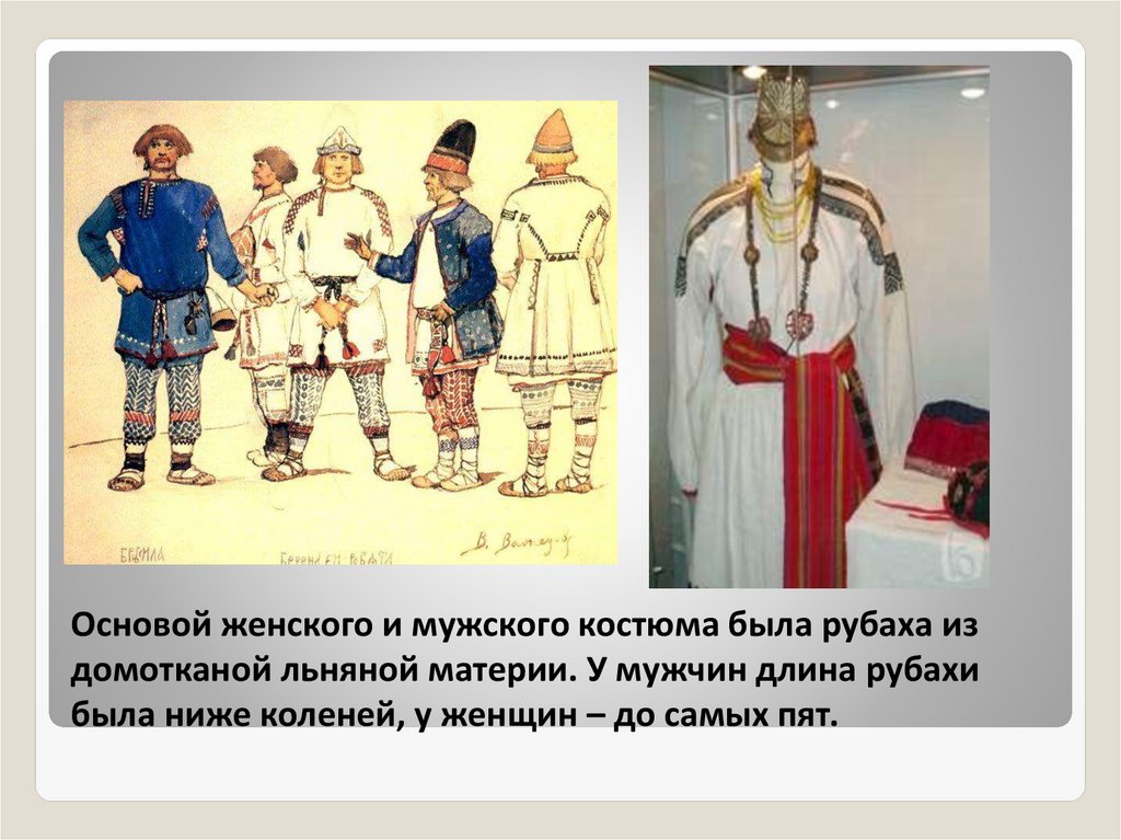 Основой женского и мужского костюма была рубаха издомотканой льняной материи. У мужчин длина рубахи