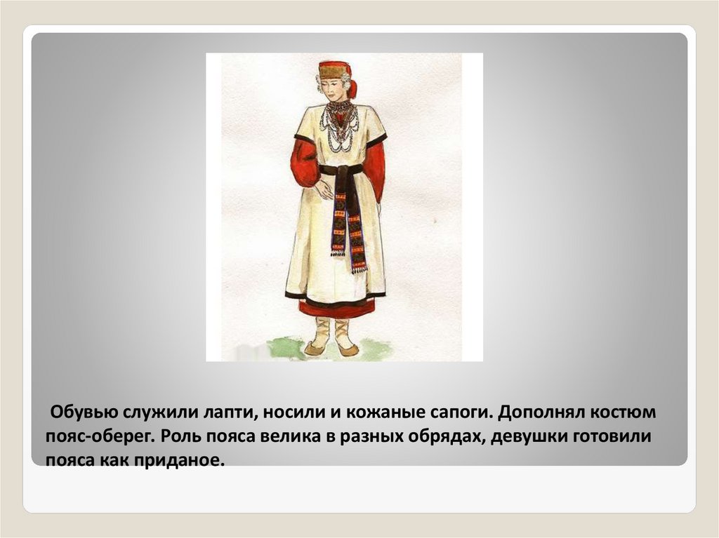 Обувью служили лапти, носили и кожаные сапоги. Дополнял костюмпояс-оберег. Роль пояса велика в разных обрядах, девушки готовили