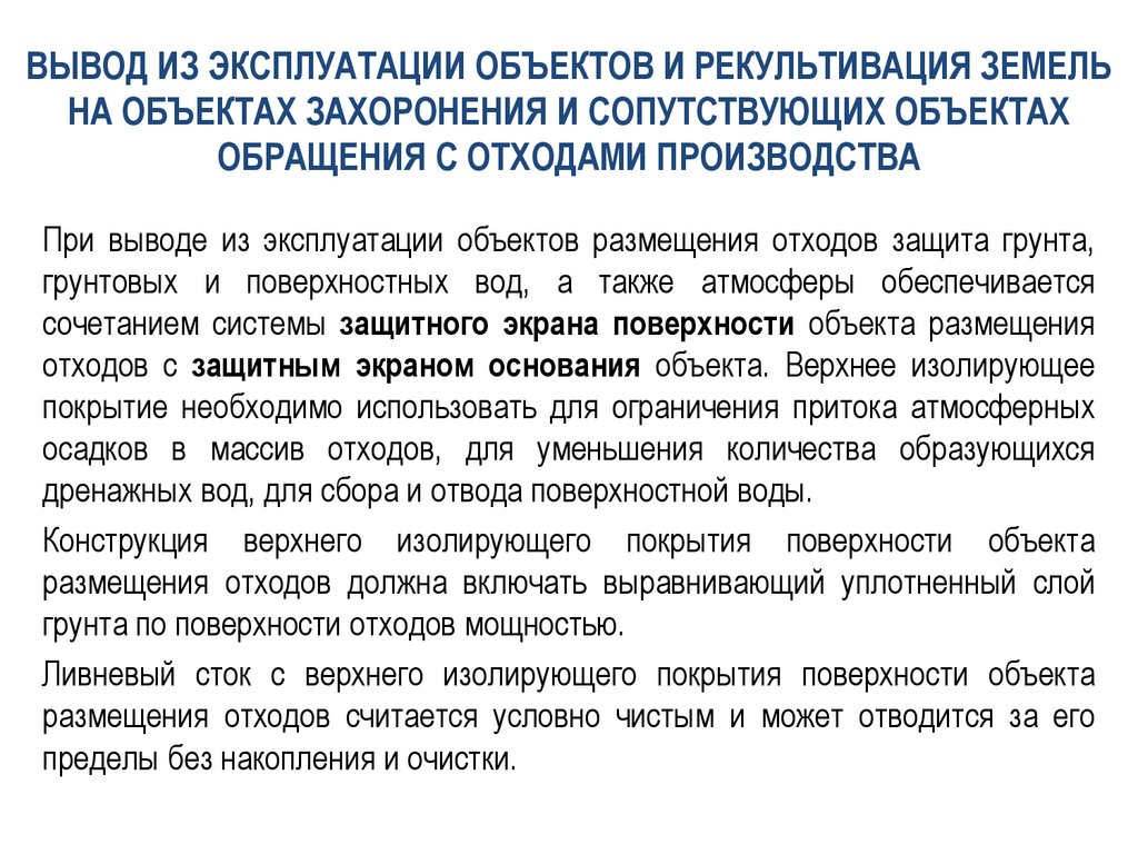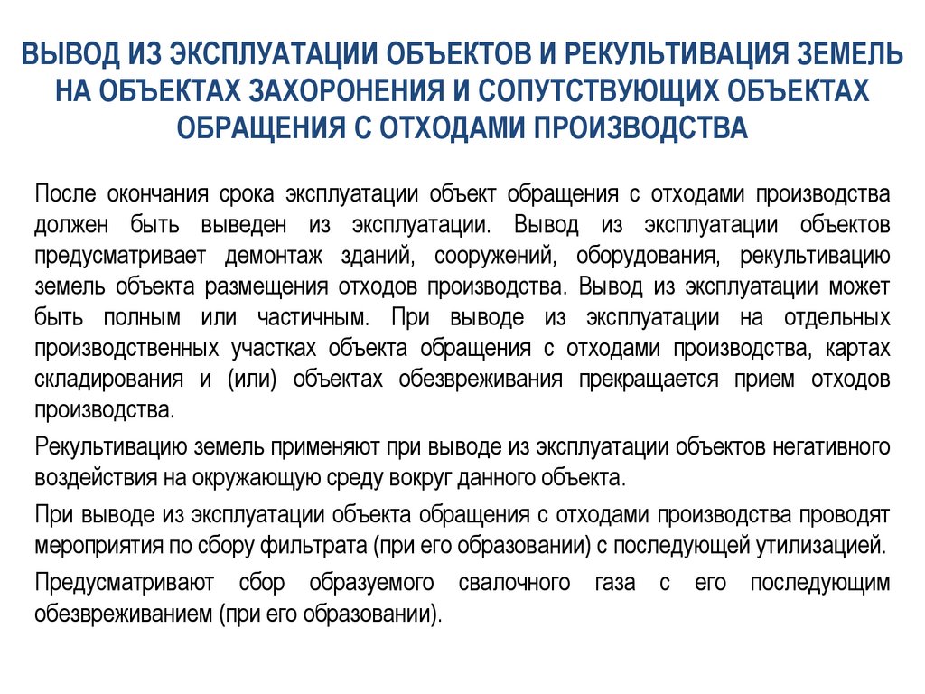 При выводе из эксплуатации объекта обращения с отходами производства проводят