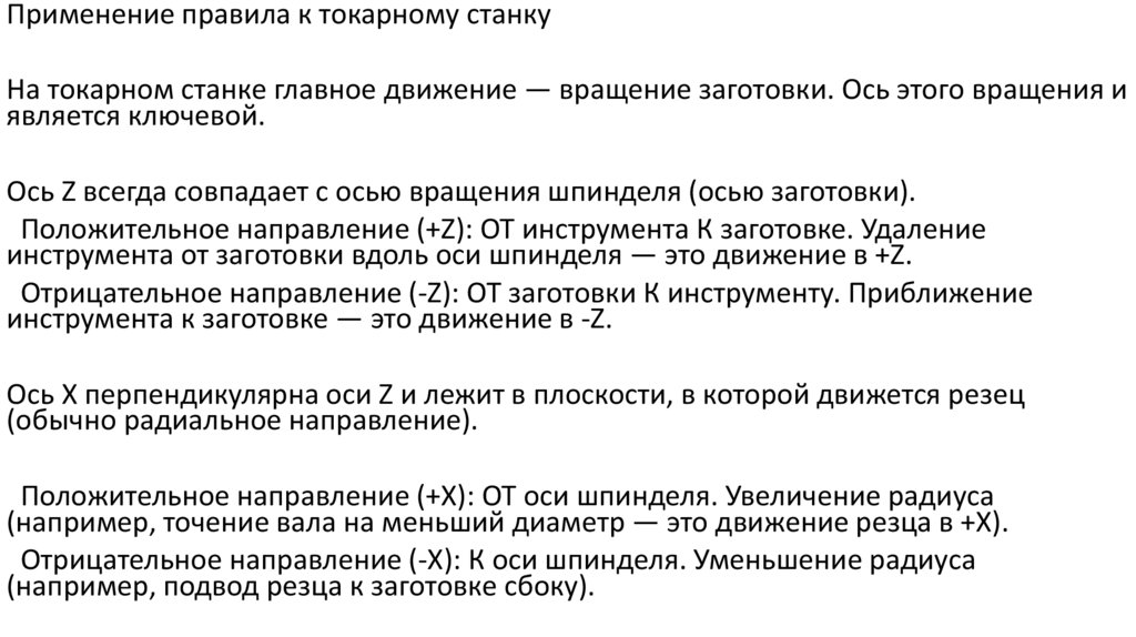 (например, точение вала на меньший диаметр — это движение резца в +X).
