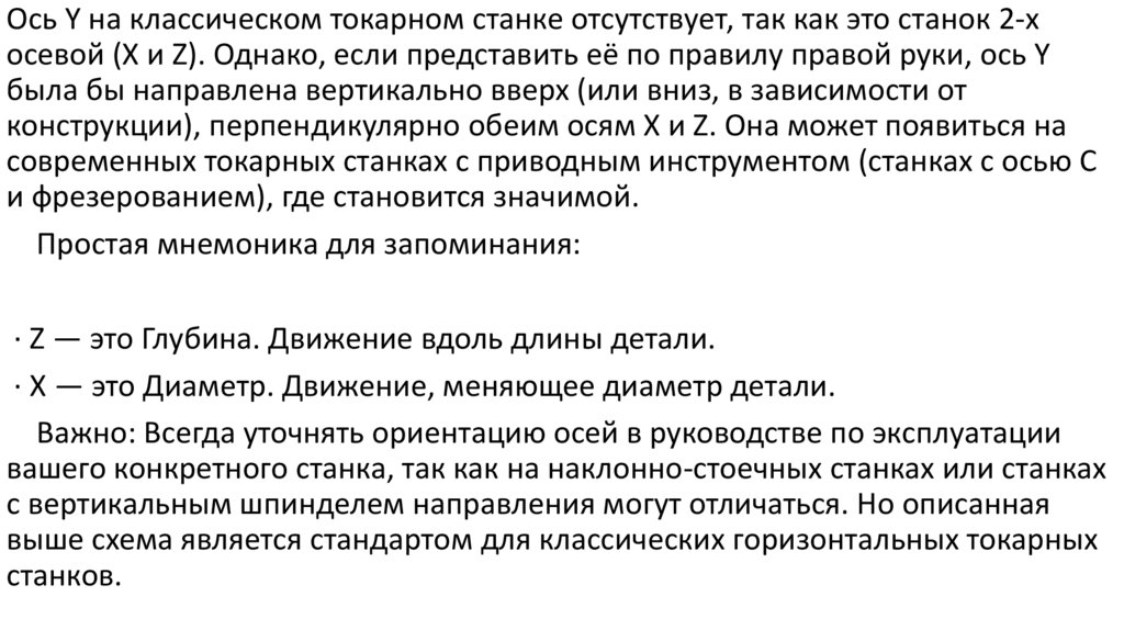 Ось Y на классическом токарном станке отсутствует, так как это станок 2-хосевой (X и Z). Однако, если представить её по правилу правой руки, ось Y