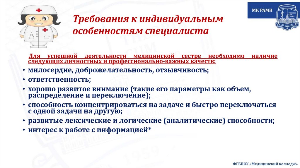 • Поскольку работа медицинской сестры связана сознаковой информацией: текстами, цифрами, таблицами,