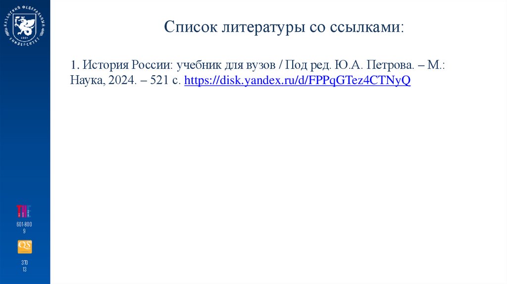 Список литературы со ссылками:1. История России: учебник для вузов / Под ред. Ю.А. Петрова. – М.: