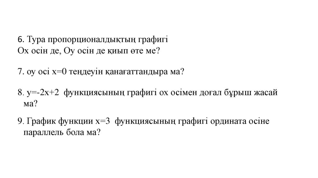 6. Тура пропорционалдықтың графигіОх осін де, Оу осін де қиып өте ме?