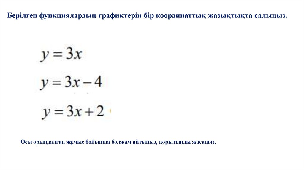 Берілген функциялардың графиктерін бір координаттық жазықтықта салыңыз.Осы орындалған жұмыс бойынша болжам айтыңыз, қорытынды жасаңыз.