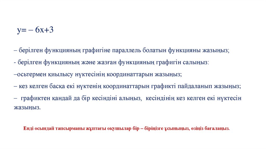 y= – 6x+3– берілген функцияның графигіне параллель болатын функцияны жазыңыз;