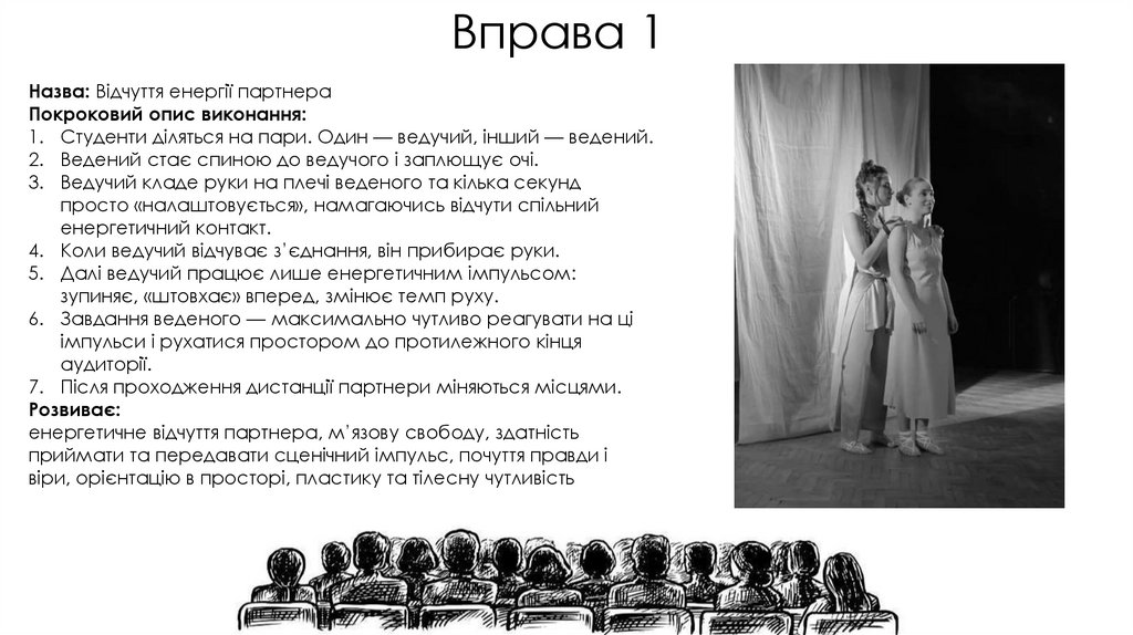 1. Розвинути здатність актора усвідомлено слухати партнера.