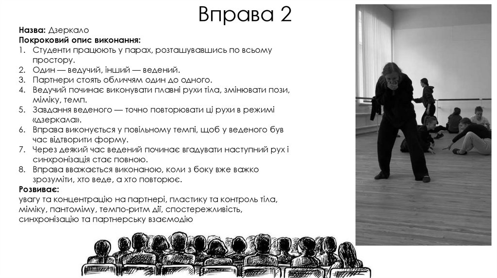 правду сценічної дії, спостережливість, орієнтацію в просторі,