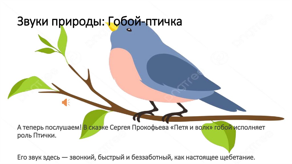 Звуки природы: Гобой-птичкаА теперь послушаем! В сказке Сергея Прокофьева «Петя и волк» гобой исполняет