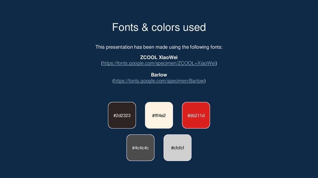 Fonts & colors usedThis presentation has been made using the following fonts: