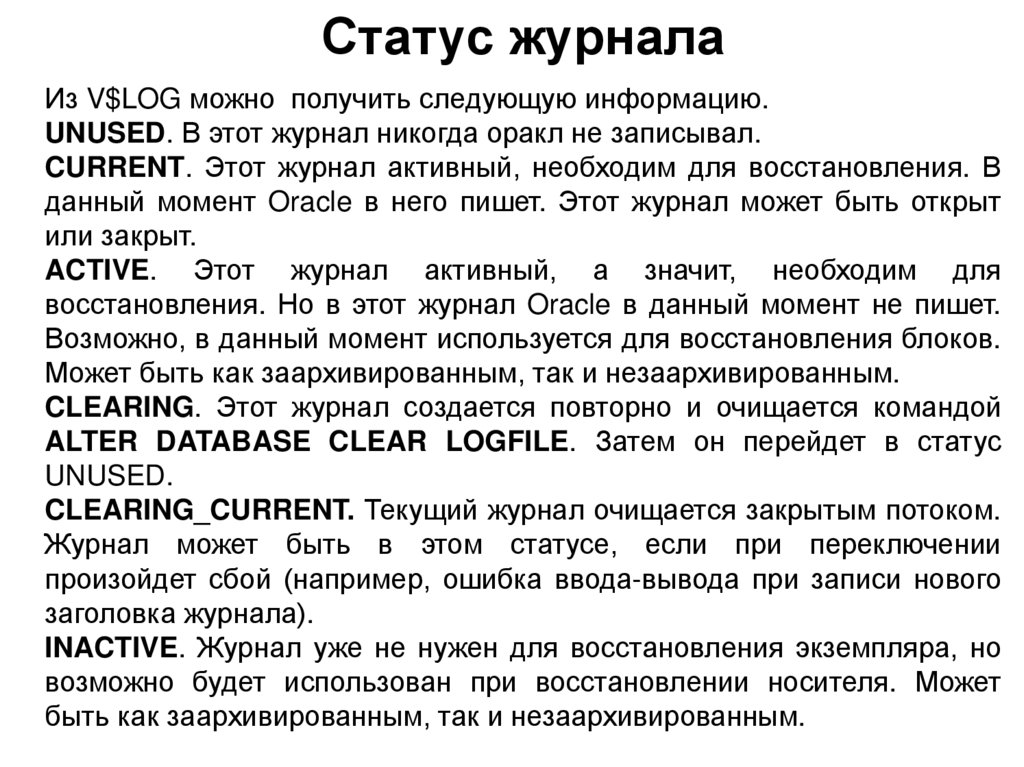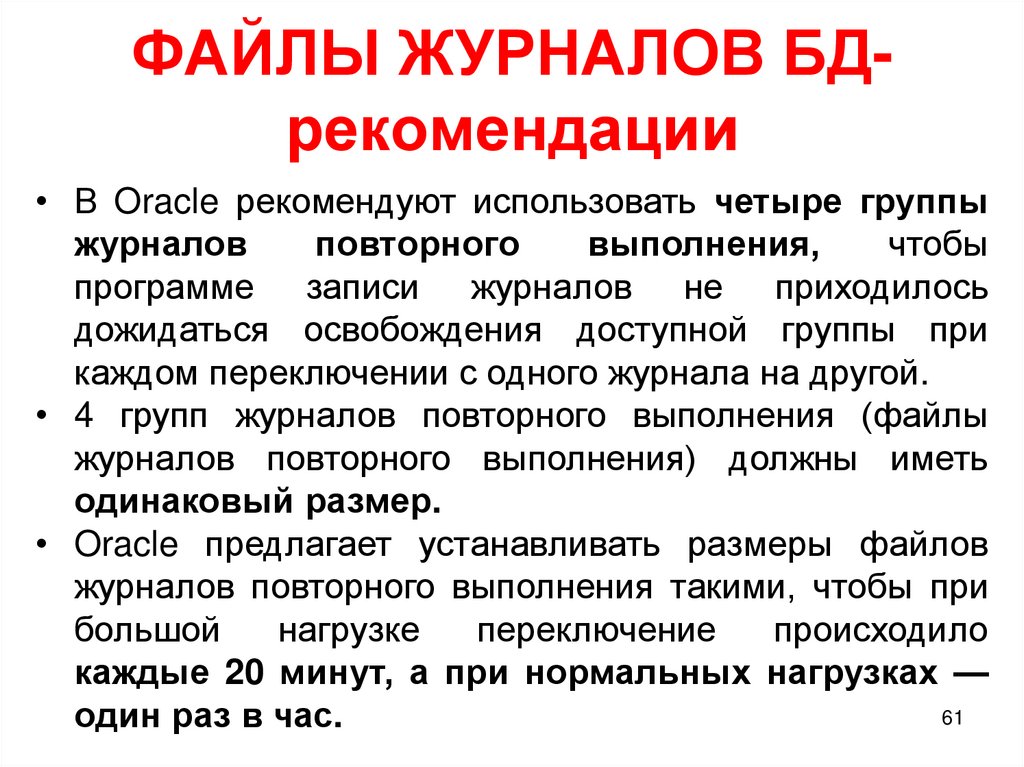 ФАЙЛЫ ЖУРНАЛОВ БДрекомендации• В Oracle рекомендуют использовать четыре группы