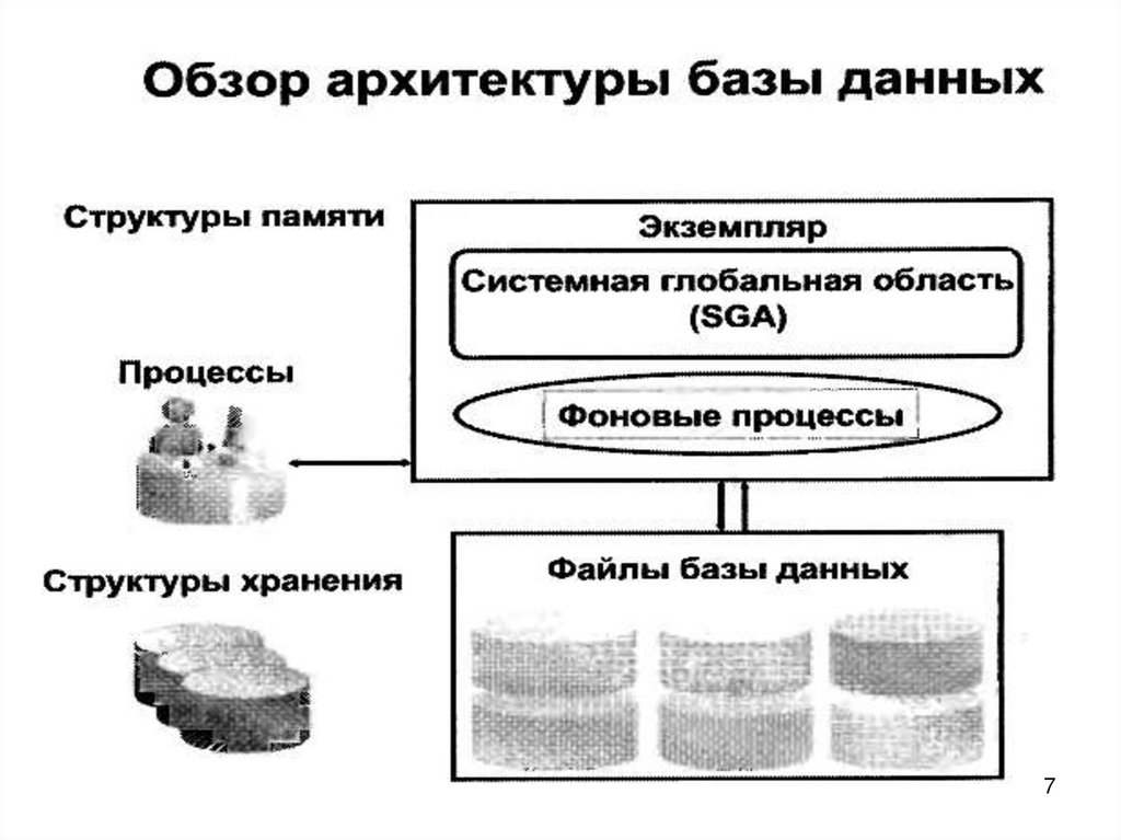 • Экземпляр – это средство доступа к БД, состоит изфоновых процессов и структур памяти, которые и