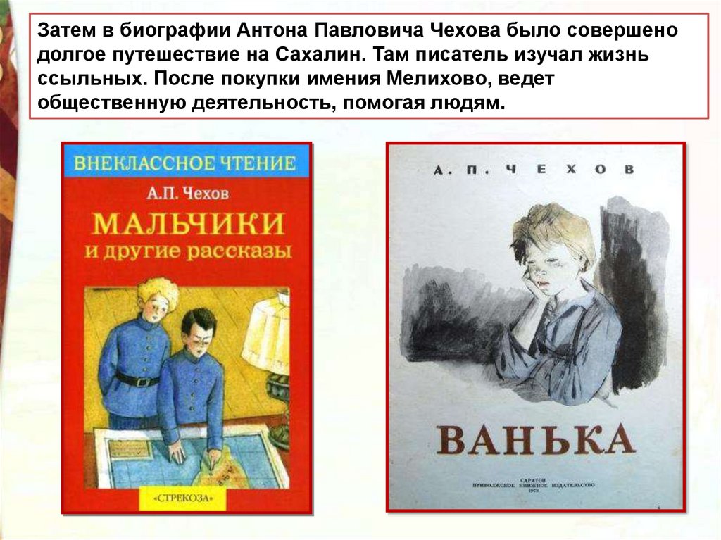 Затем в биографии Антона Павловича Чехова было совершенодолгое путешествие на Сахалин. Там писатель изучал жизнь