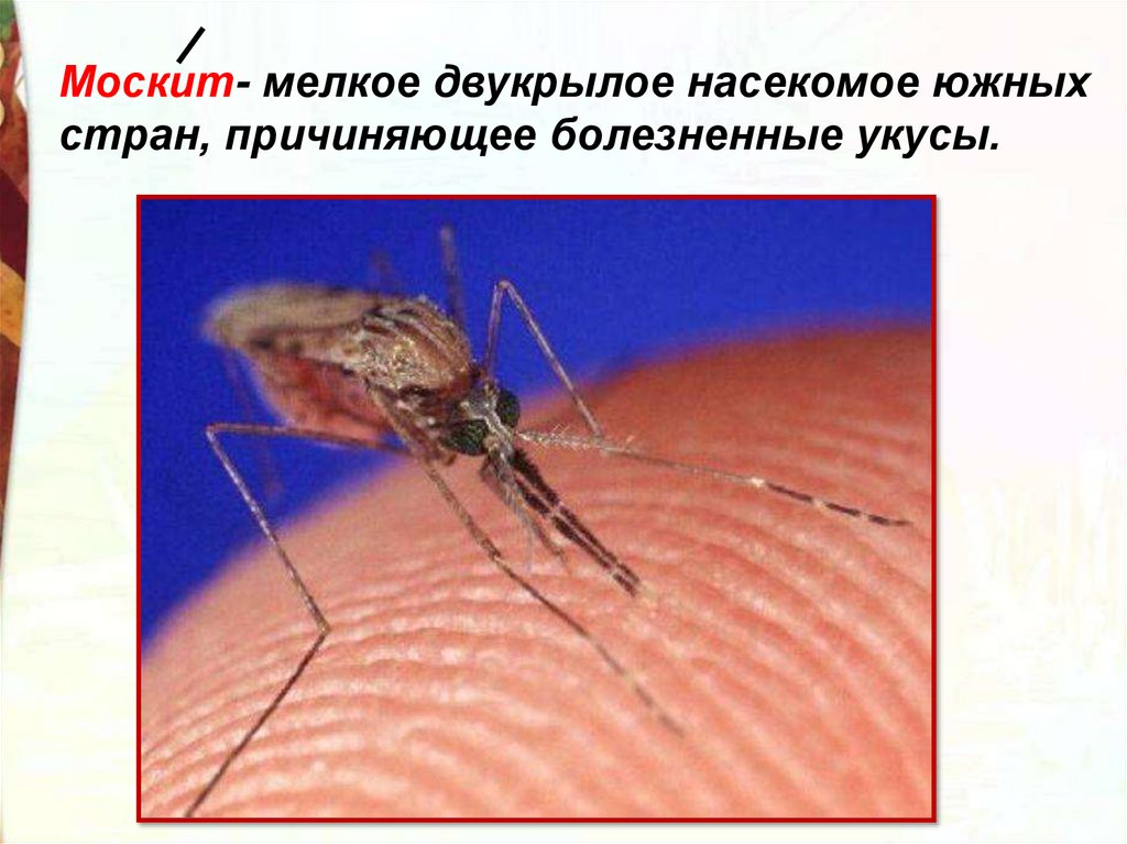 Москит- мелкое двукрылое насекомое южныхстран, причиняющее болезненные укусы.