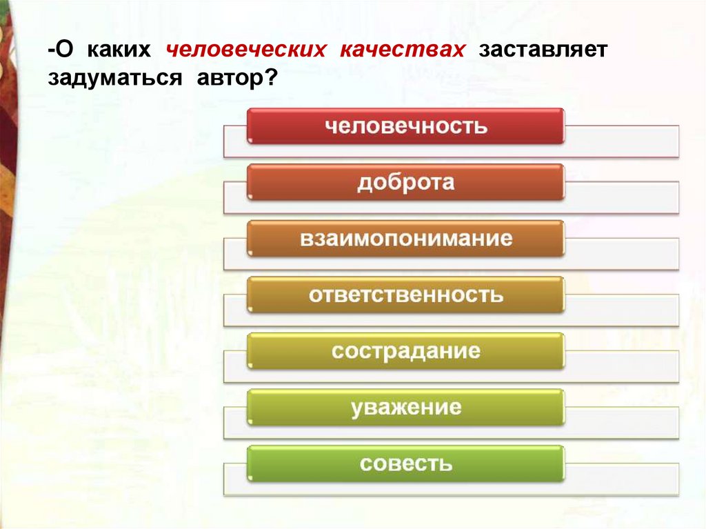 -О каких человеческих качествах заставляетзадуматься автор?