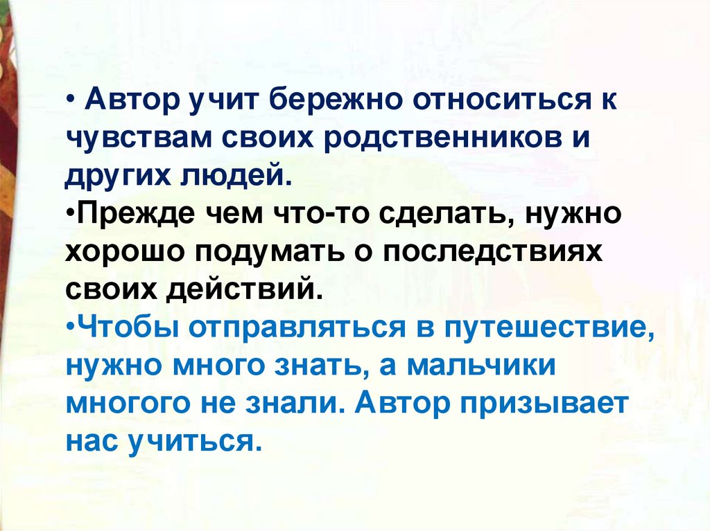 • Автор учит бережно относиться кчувствам своих родственников и