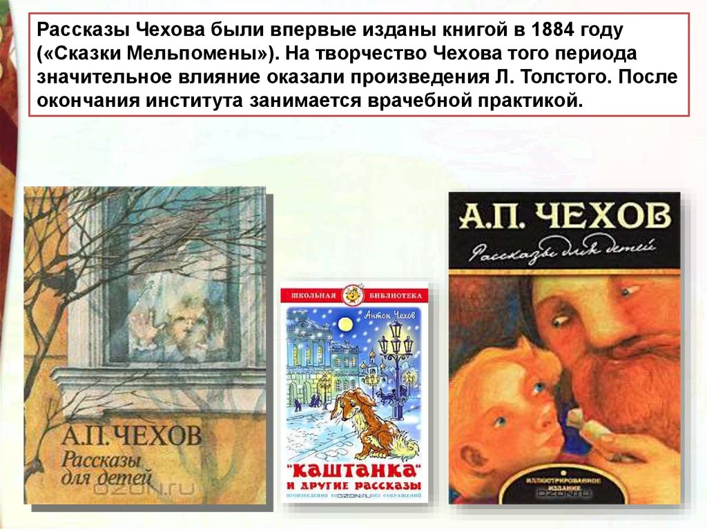Рассказы Чехова были впервые изданы книгой в 1884 году(«Сказки Мельпомены»). На творчество Чехова того периода