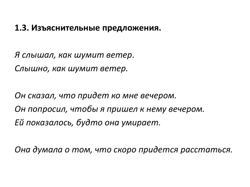 1.3. Изъяснительные предложения.Я слышал, как шумит ветер.