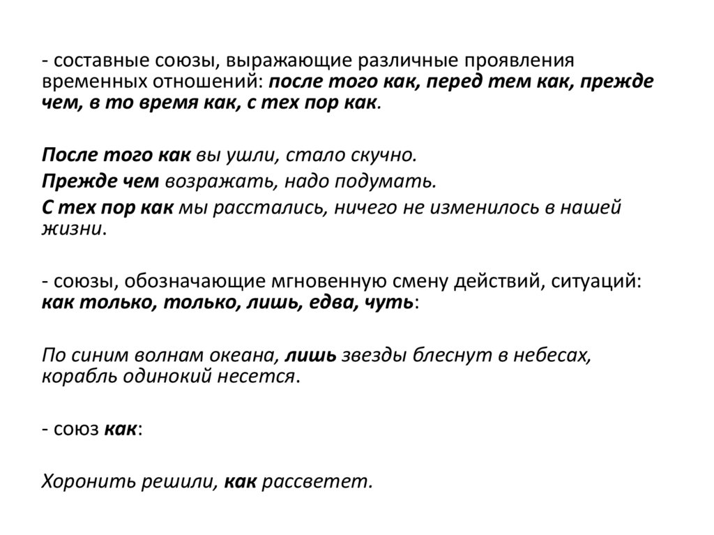 - составные союзы, выражающие различные проявлениявременных отношений: после того как, перед тем как, прежде