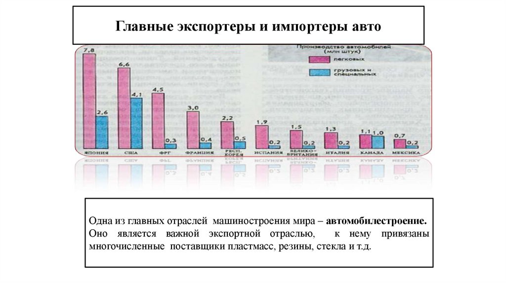 Главные экспортеры и импортеры автоОдна из главных отраслей машиностроения мира – автомобилестроение.