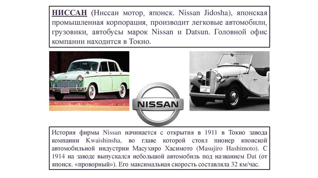 История фирмы Nissan начинается с открытия в 1911 в Токио завода