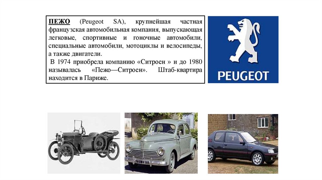 ПЕЖО (Peugeot SA), крупнейшая частнаяфранцузская автомобильная компания, выпускающая