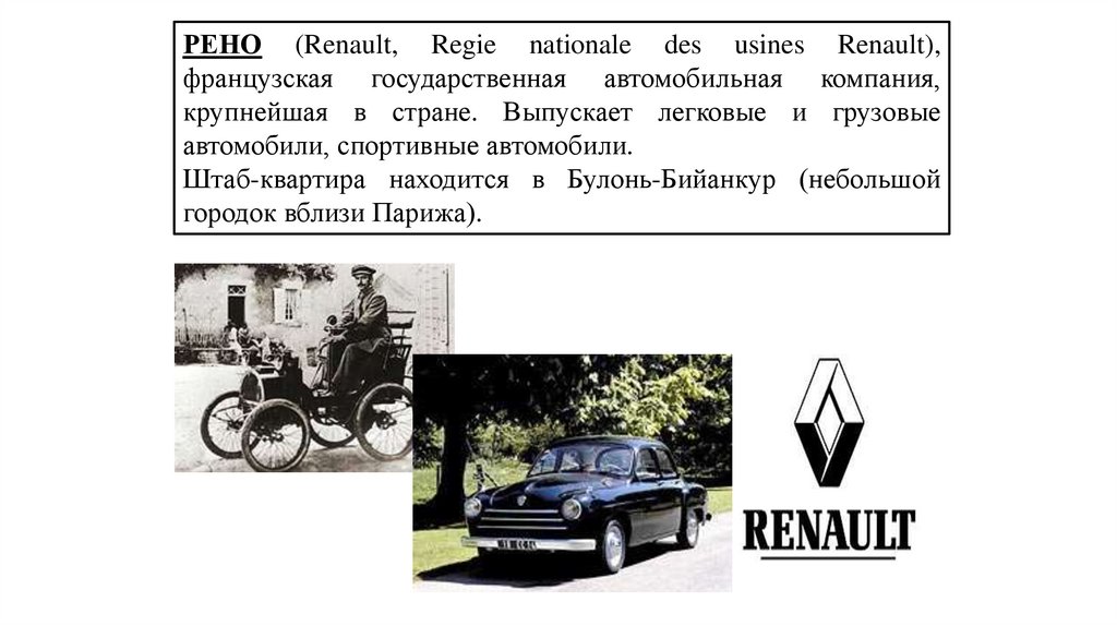 РЕНО (Renault, Regie nationale des usines Renault),французская государственная автомобильная компания,