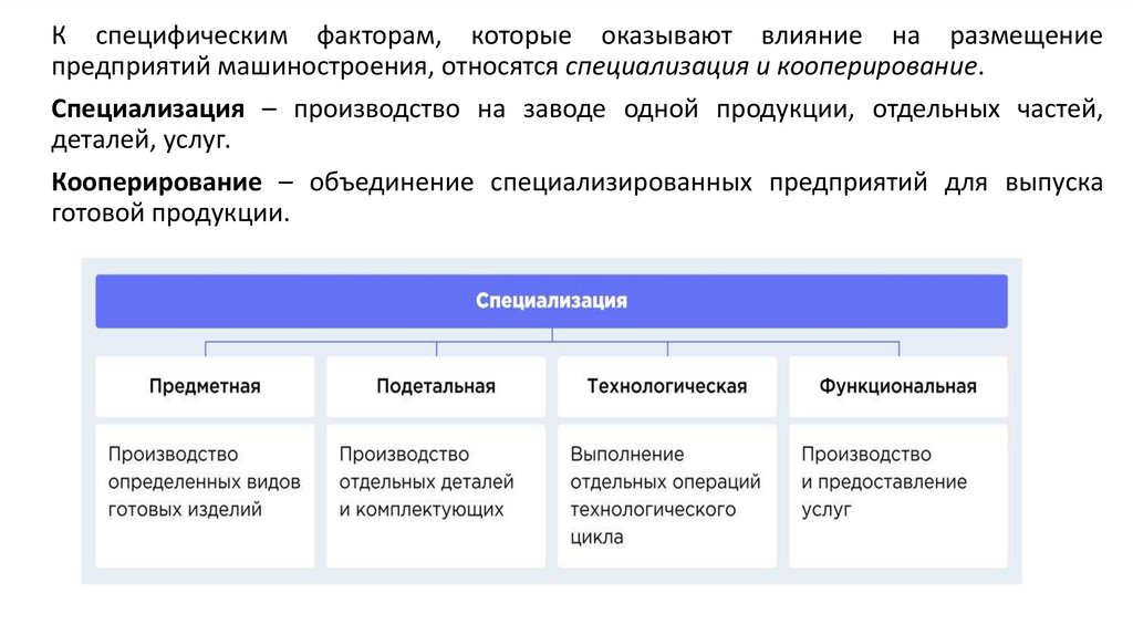 К специфическим факторам, которые оказывают влияние на размещениепредприятий машиностроения, относятся специализация и кооперирование.