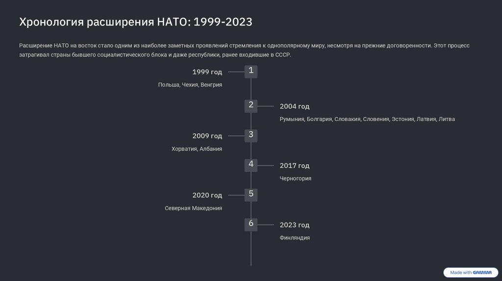 Хронология расширения НАТО: 1999-2023Расширение НАТО на восток стало одним из наиболее заметных проявлений стремления к однополярному миру, несмотря на прежние договоренности. Этот процесс