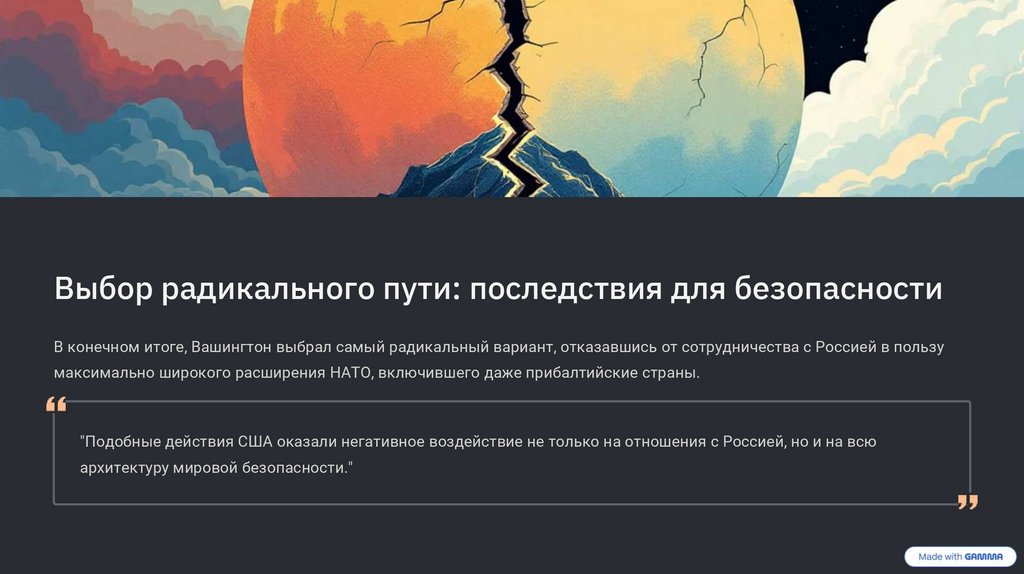 Выбор радикального пути: последствия для безопасностиВ конечном итоге, Вашингтон выбрал самый радикальный вариант, отказавшись от сотрудничества с Россией в пользу