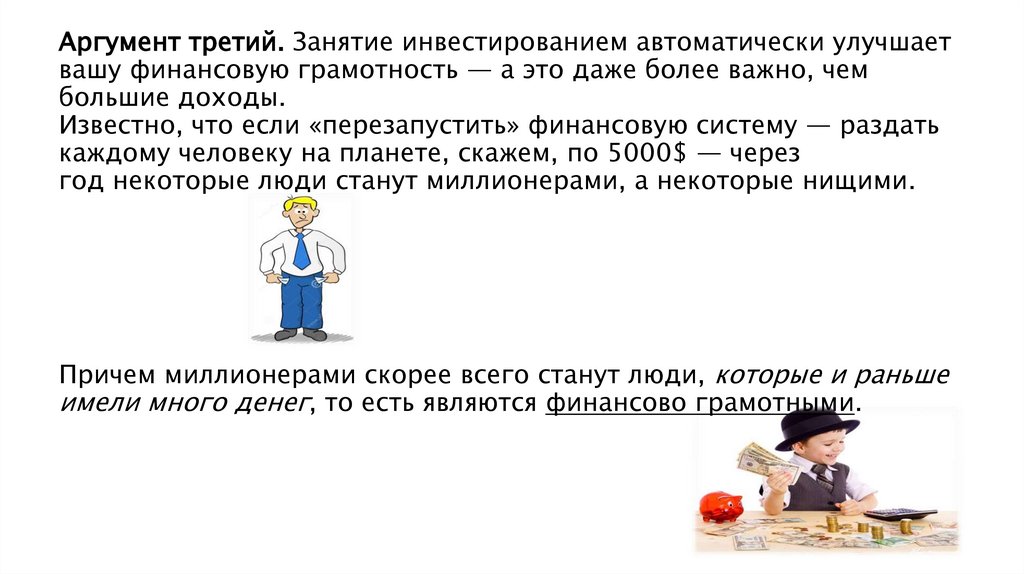 Аргумент третий. Занятие инвестированием автоматически улучшаетвашу финансовую грамотность — а это даже более важно, чем